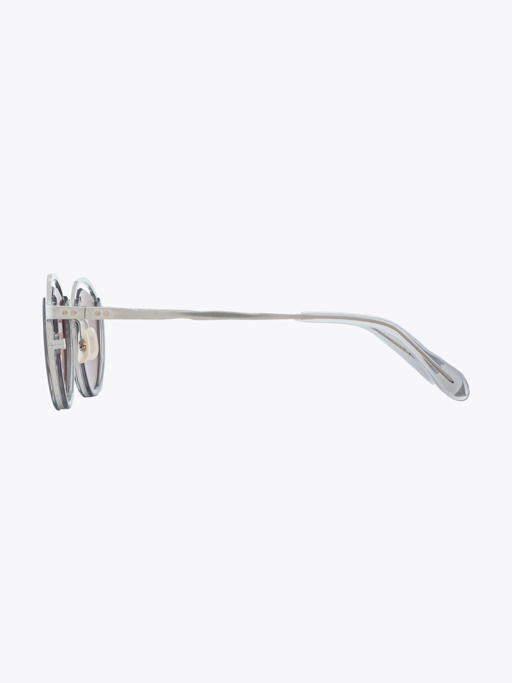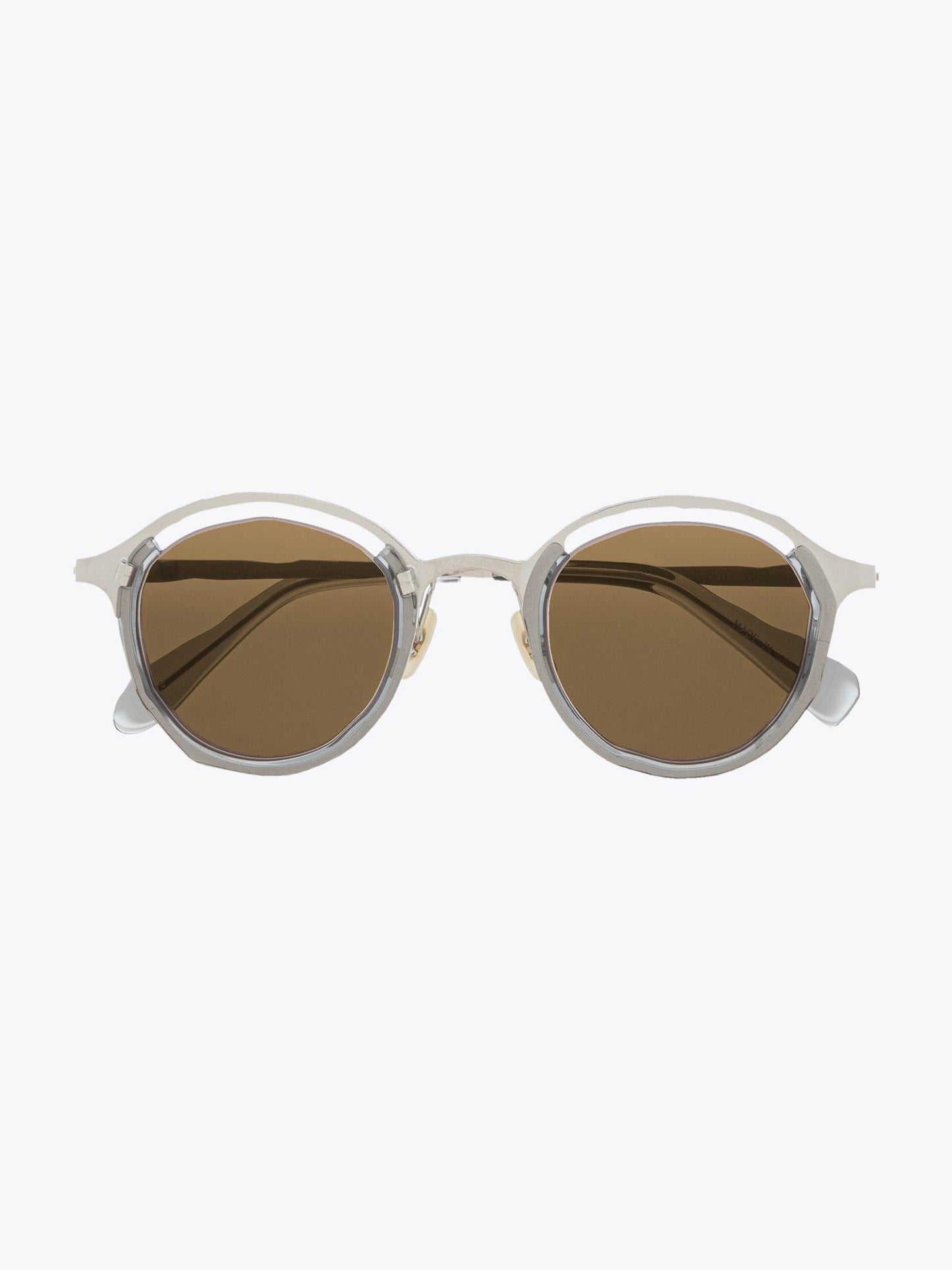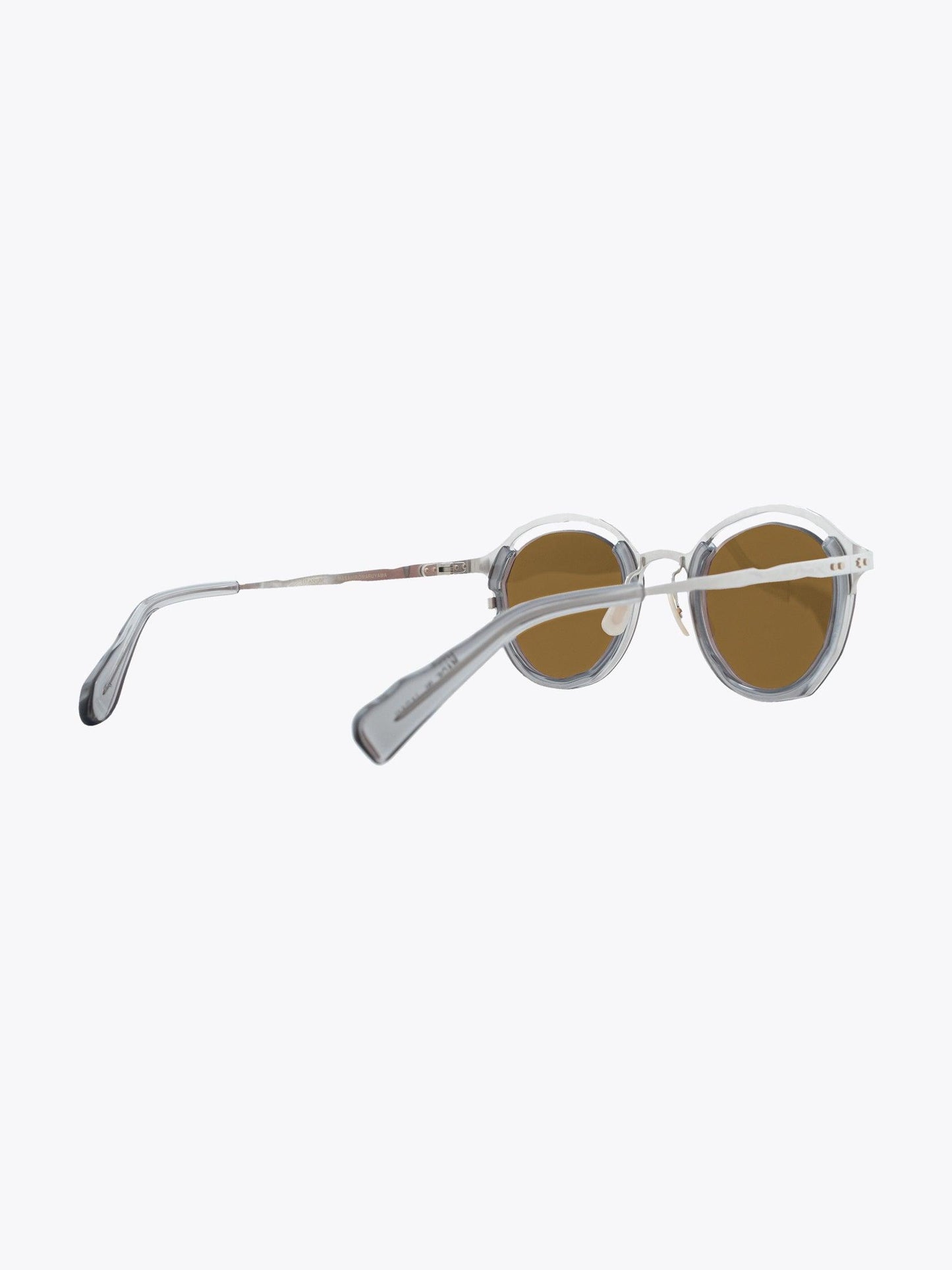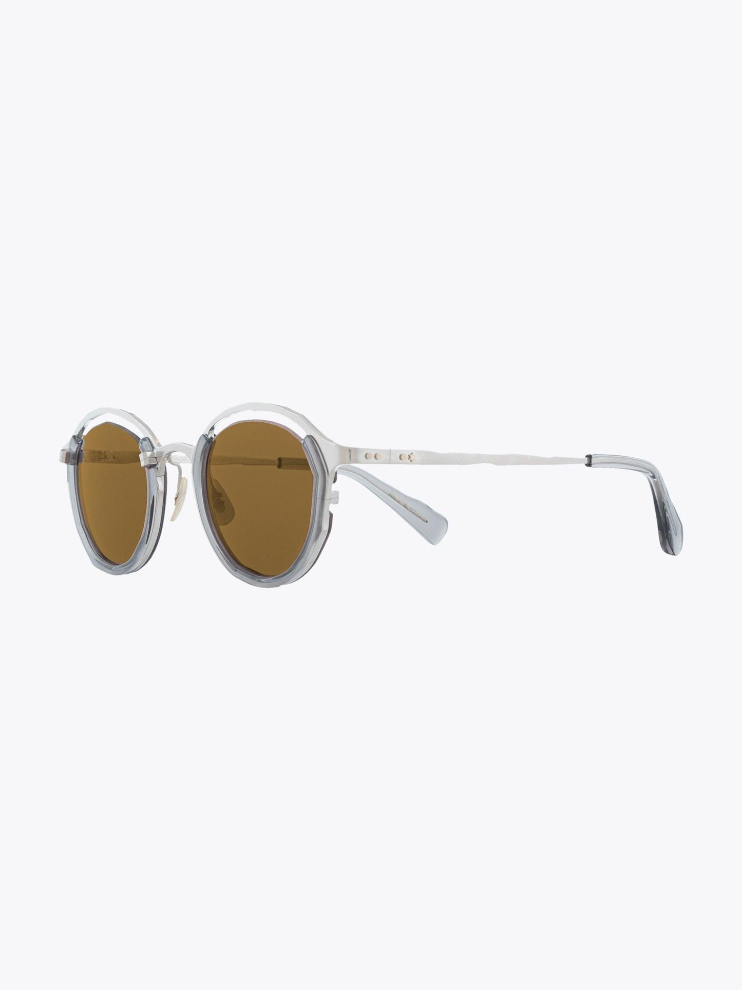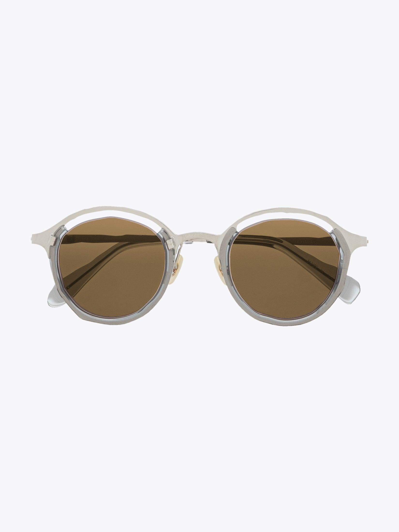 Sonnenbrille von Masahiromaruyama, Linie Monocle, mit rundem Gestell. Handgefertigt aus silbernem Titan und klarem grauen Acetat. Die Gläser sind glasbraun und bieten 100% UV-Schutz vor UV-Strahlen. Sie wird mit einem Etui aus Logo-Leder und einem Reinigungstuch in einer Papierbox geliefert.